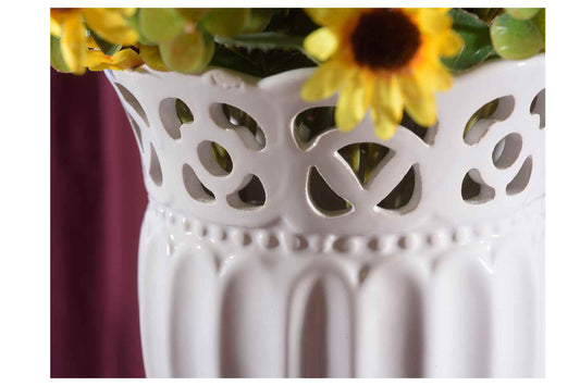 Vaso sagomato in ceramica lucida con bordo decorato. Misure: Ø 14,5 cm x 26 H Ø base 6,5 cm