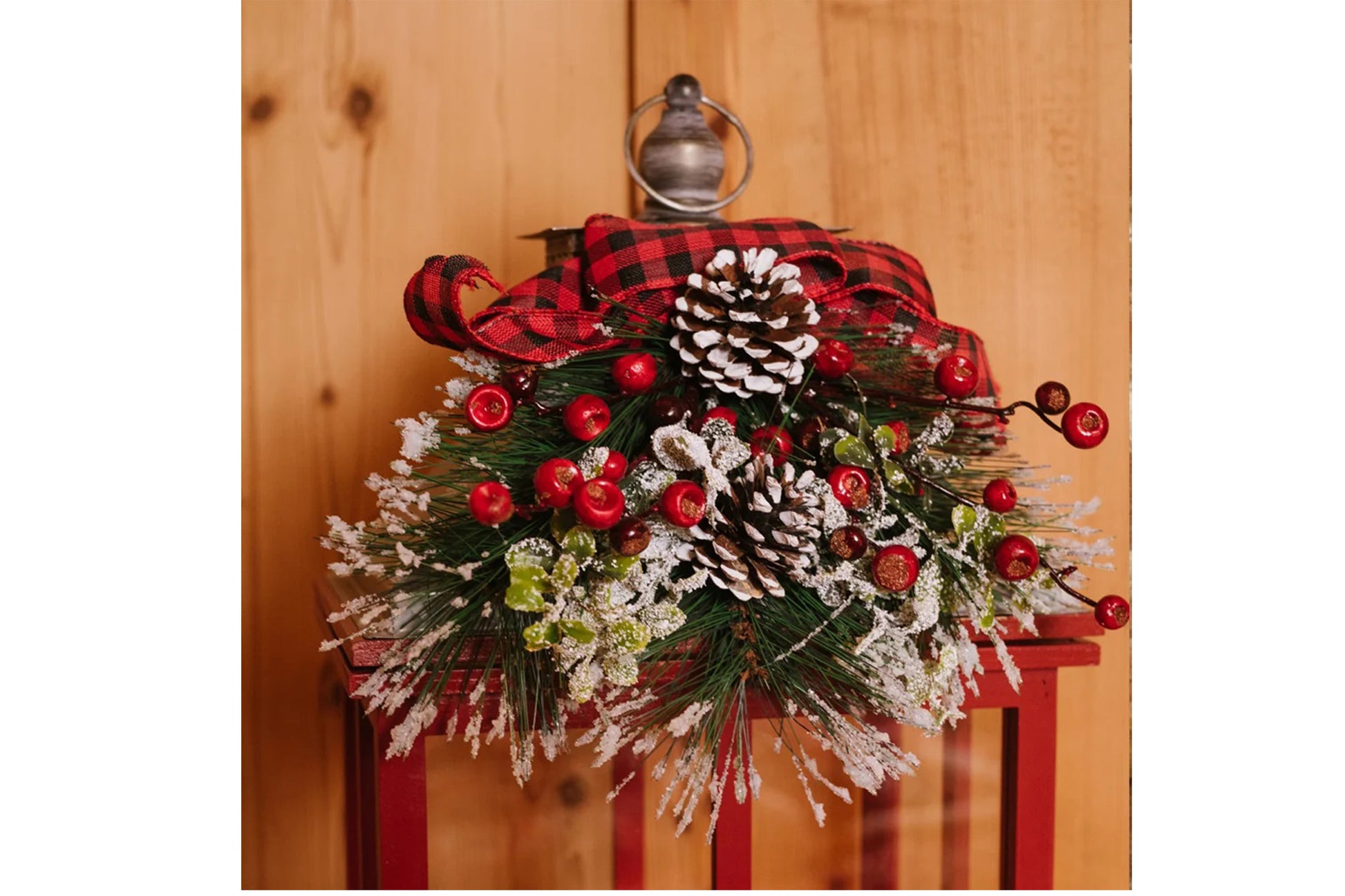 Lanterna in legno rosso con pigna e bacche h 50 cm