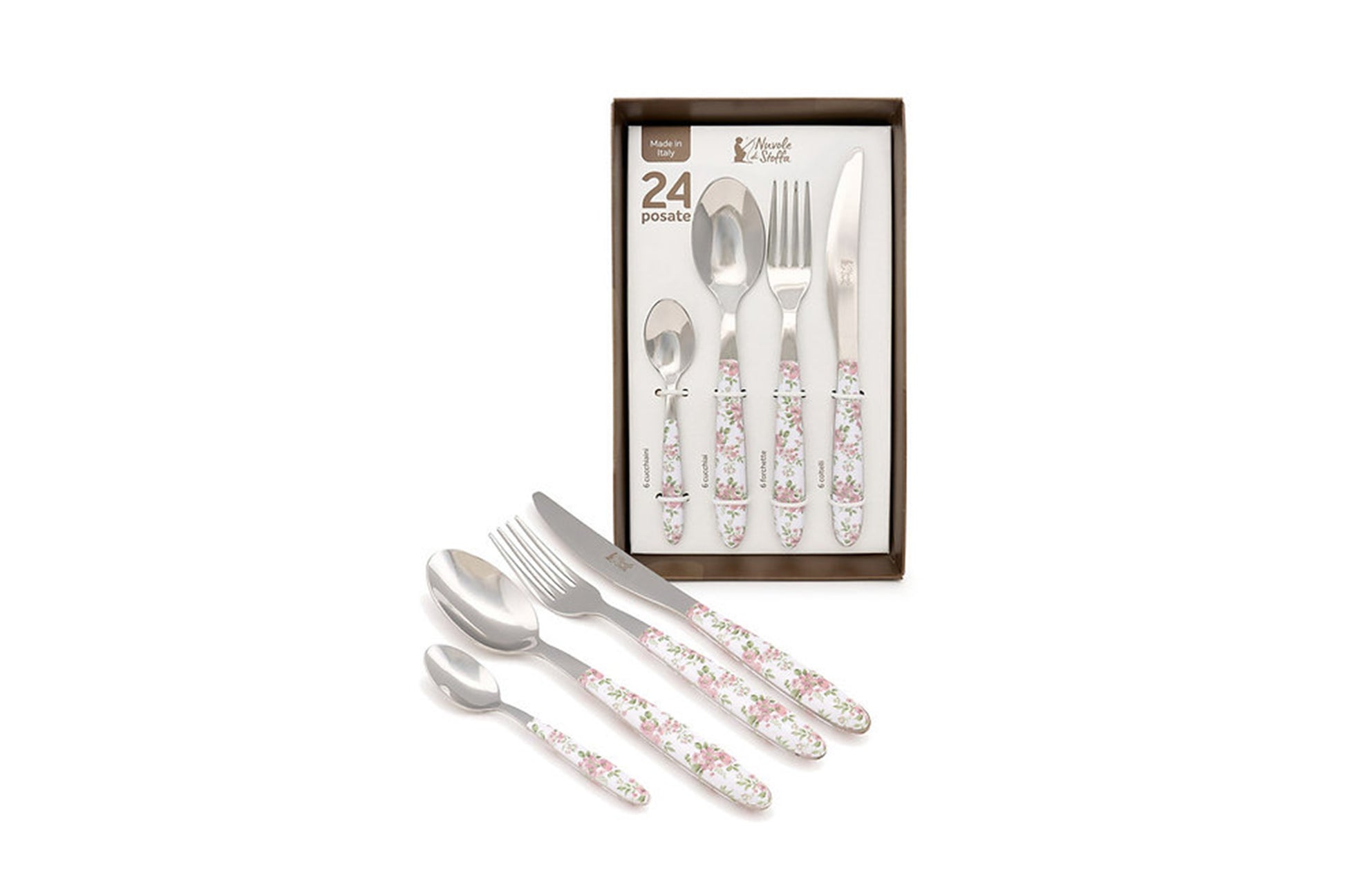 Il servizio comprende: 6 cucchiai, 6 coltelli, 6 forchette e 6 cucchiaini.