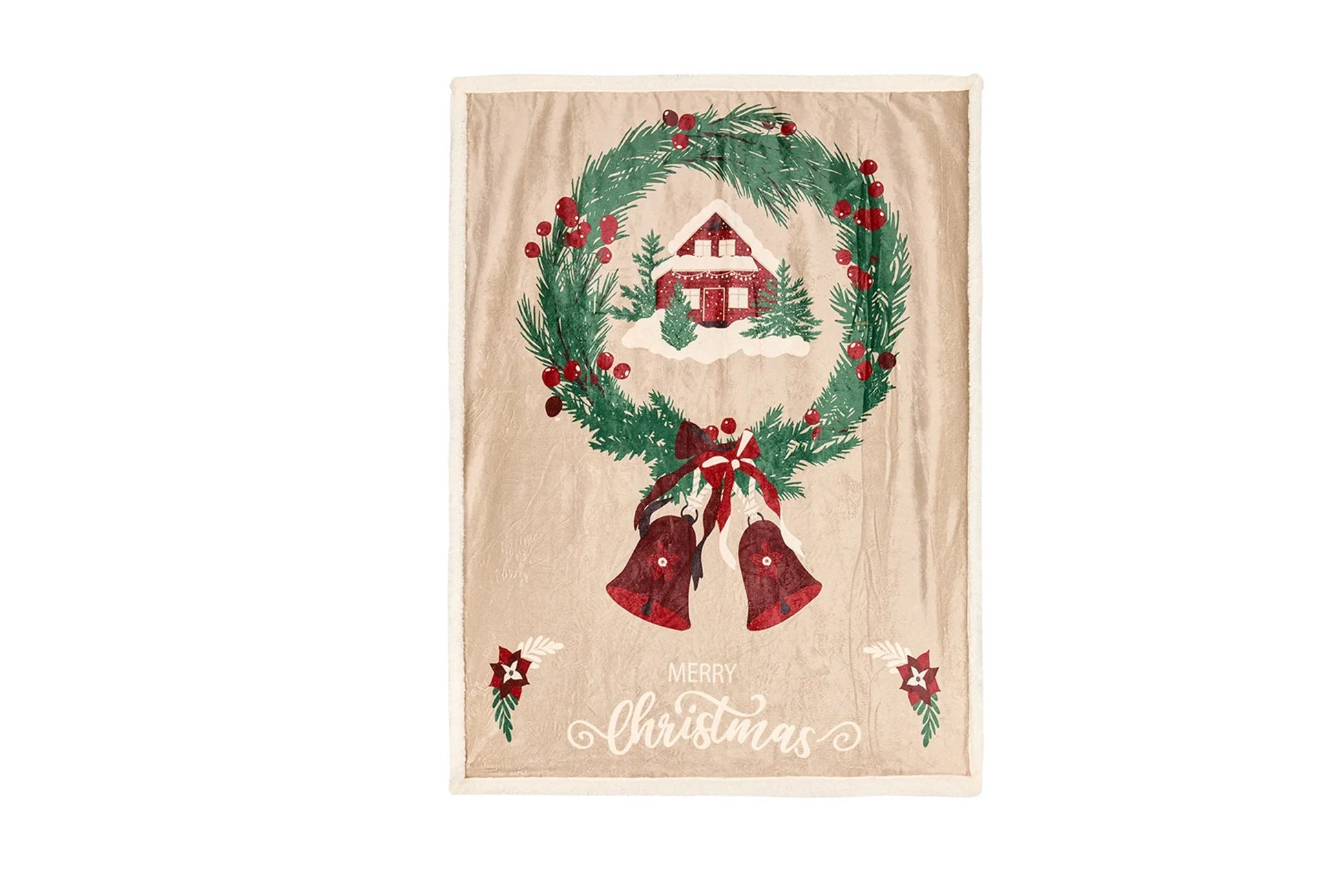 Plaid beige in pile con stampa casetta montana avvolta in una ghirlanda e campane 130x160