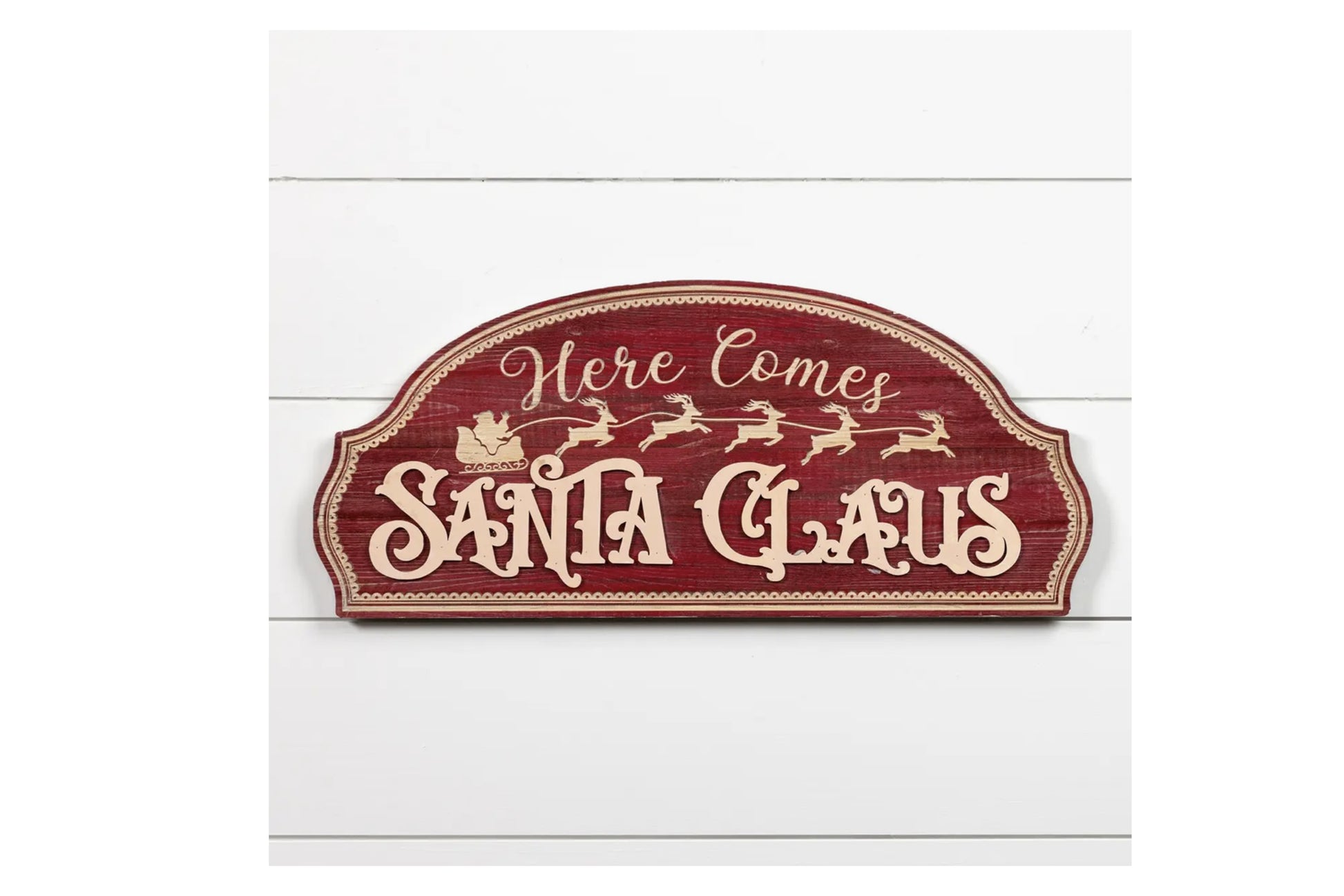 Targa di natale in legno " Santa Claus" con decori in rilievo. Misura 60x26 cm