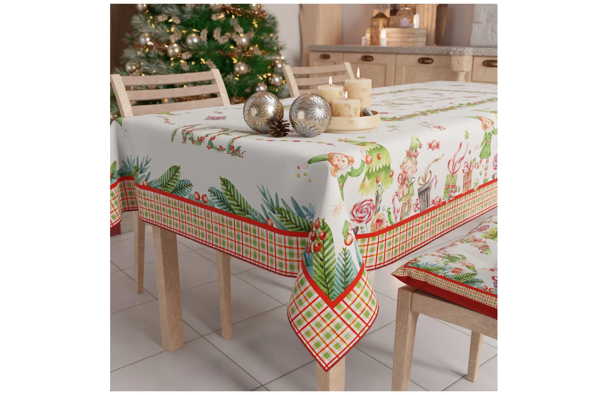 Tovaglia natalizia in microfibra e antimacchia da 12 posti tavola con stampa digitale. Misura 140x240. Noel