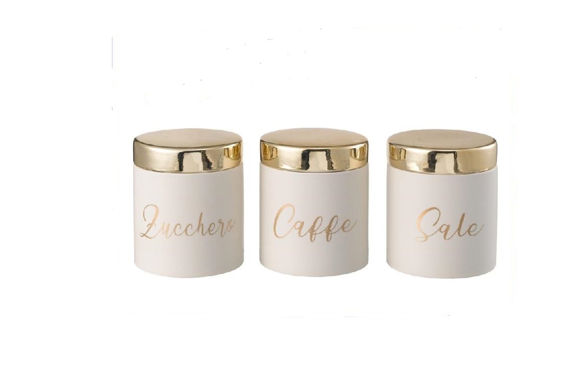 Tris barattoli bianchi in ceramica con tappo ermetico color oro. Misura 11x13,5