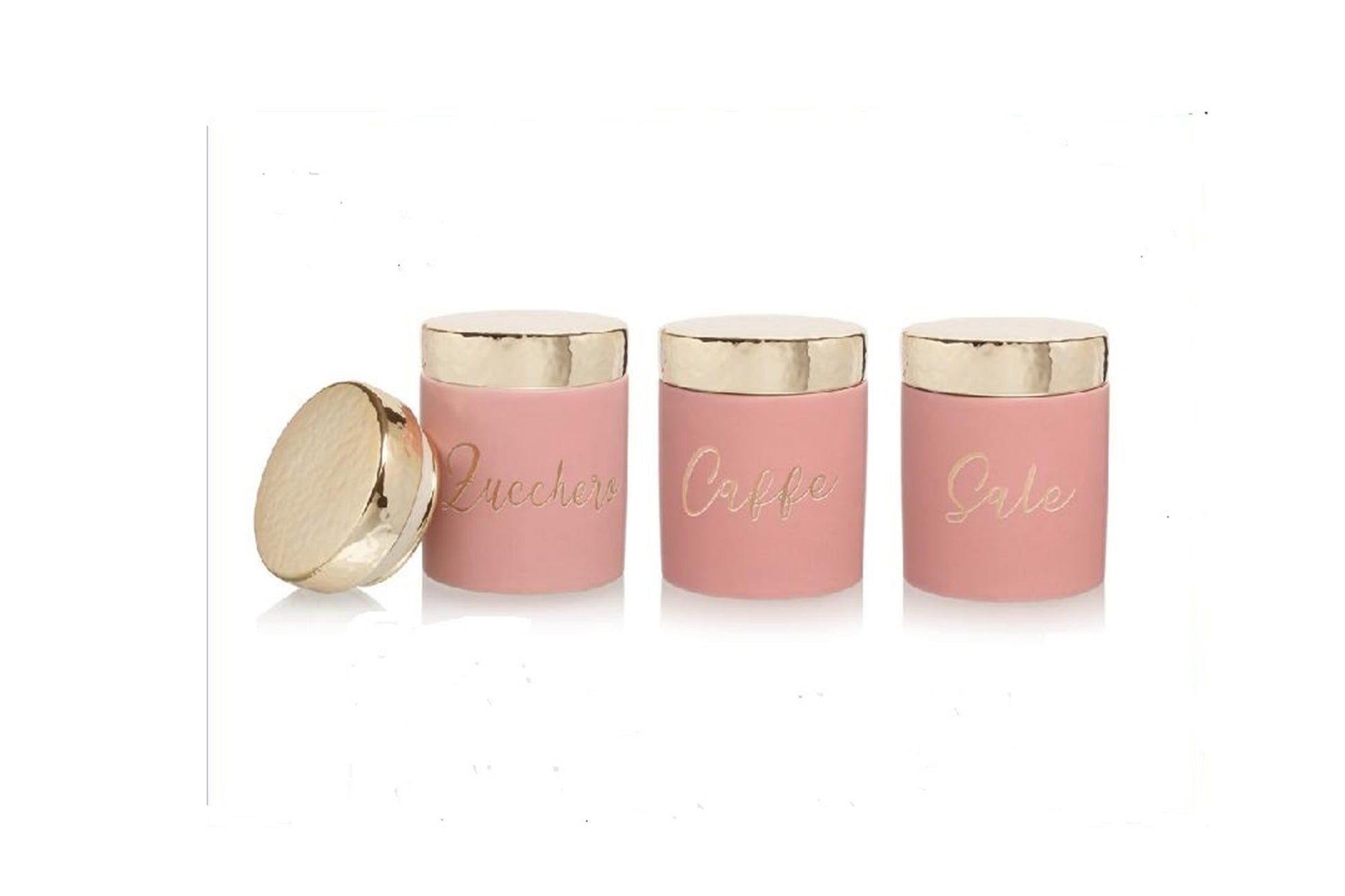 Tris barattoli in ceramica rosa con tappo ermetico color oro. Misura 11x13,5